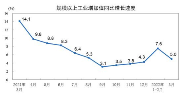 2022年3月份规模以上工业增加值增长5%,其中工业机器人增长16.6%